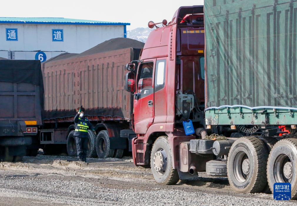 3月13日,在新疆塔克什肯口岸,工作人員引導(dǎo)入境焦煤運(yùn)輸車輛過檢。