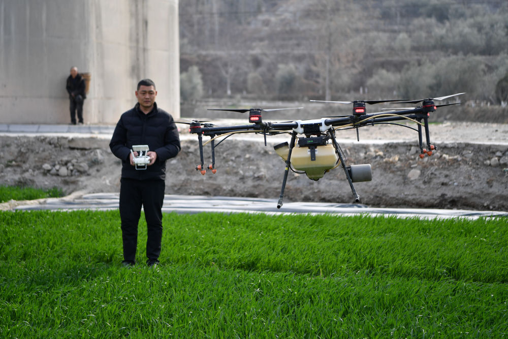 2024年3月9日,甘肅省隴南市武都區(qū)漢王鎮(zhèn)農(nóng)業(yè)技術(shù)推廣站技術(shù)人員楊亮亮操作植保無人機(jī)給冬小麥?zhǔn)┓省P氯A社記者 陳斌 攝