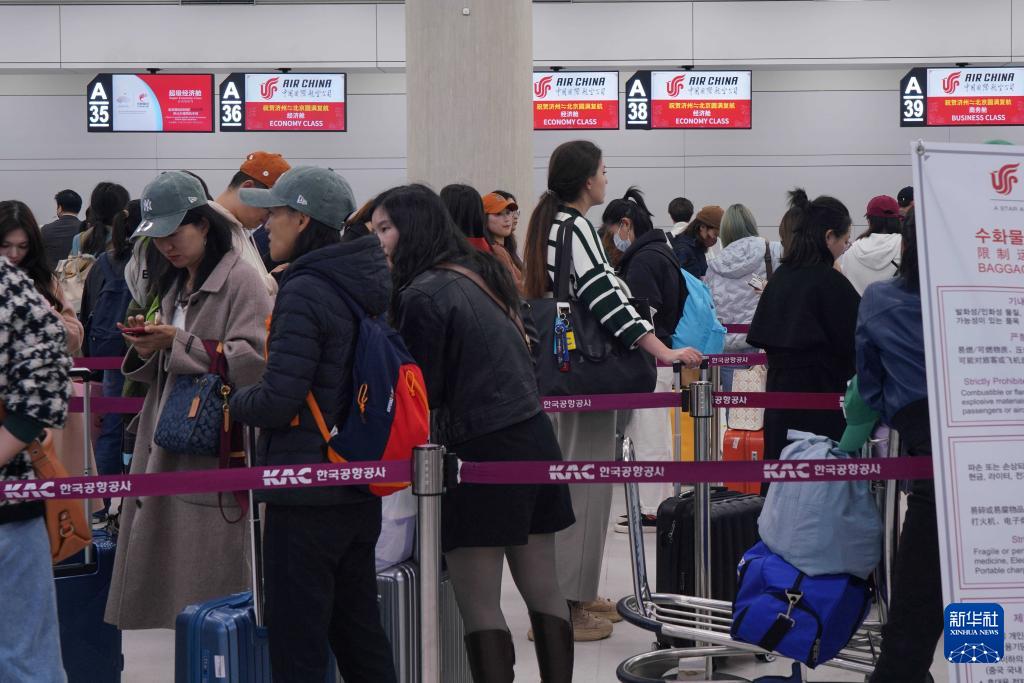 3月31日,在韓國(guó)濟(jì)州國(guó)際機(jī)場(chǎng),乘坐國(guó)航濟(jì)州至北京航線班機(jī)的旅客排隊(duì)值機(jī)。