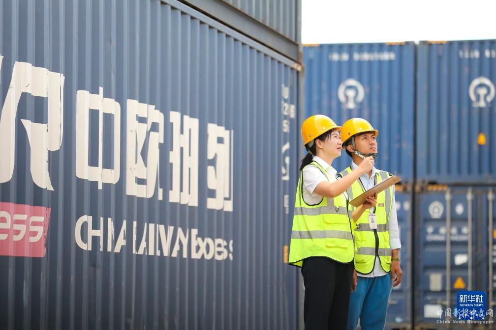 4月11日,在中老鐵路老撾萬象南站貨場(chǎng),中老員工一同核驗(yàn)集裝箱。新華社發(fā)(楊永全攝)