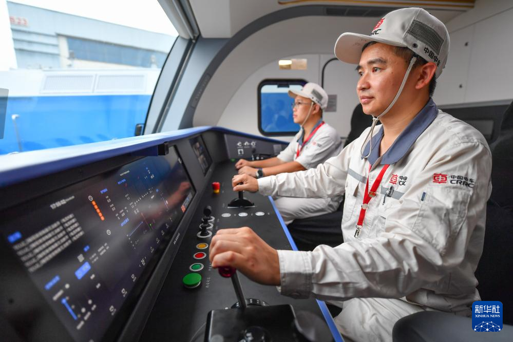5月9日,工作人員在機車的智能座艙內(nèi)查看視頻監(jiān)控、360環(huán)影的運行情況。