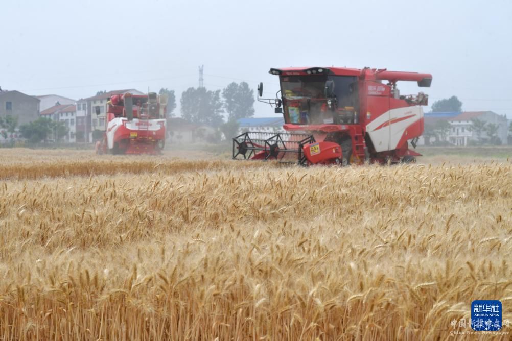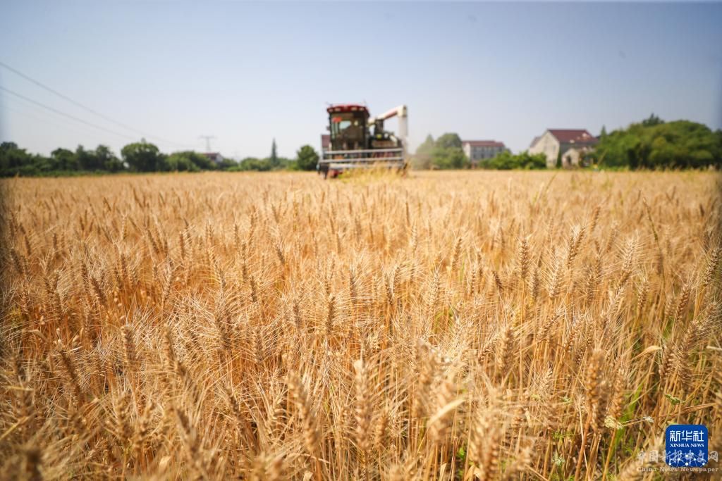 5月18日,在浙江省湖州市德清縣鐘管鎮(zhèn)蠡山村一處麥田,收割機(jī)在麥田中作業(yè)。