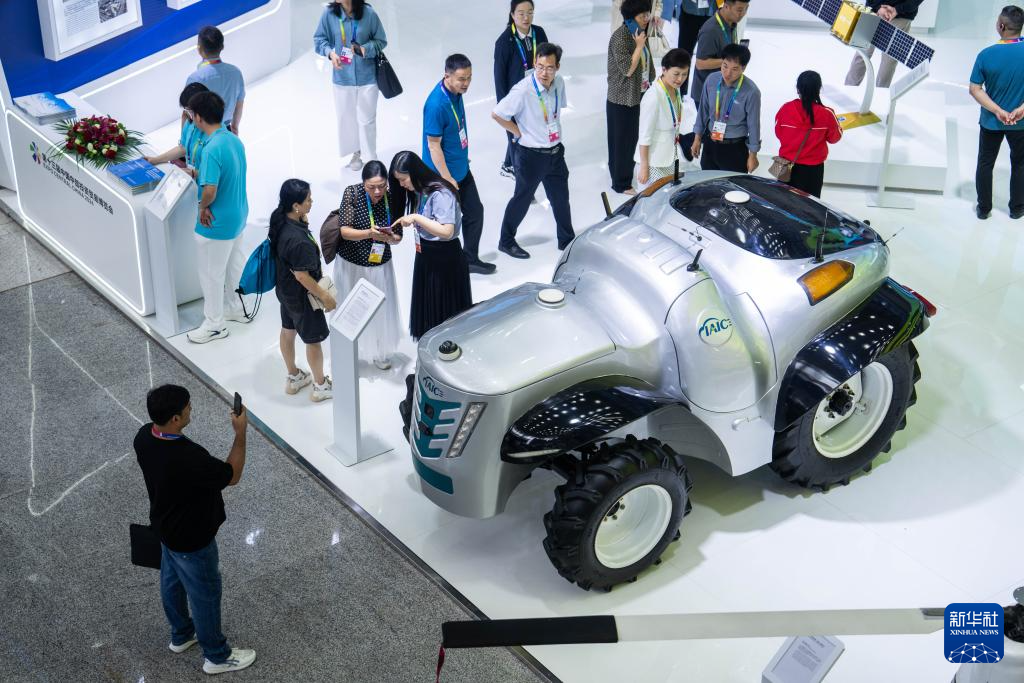5月31日,觀眾在第十三屆中國(guó)中部投資貿(mào)易博覽會(huì)上了解5G+氫能源無人駕駛拖拉機(jī)。