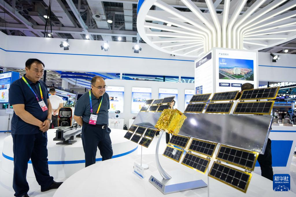 5月31日,參展商(右一)在第十三屆中國(guó)中部投資貿(mào)易博覽會(huì)上向觀眾介紹“天都一號(hào)”通導(dǎo)技術(shù)試驗(yàn)衛(wèi)星。