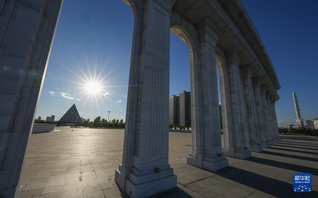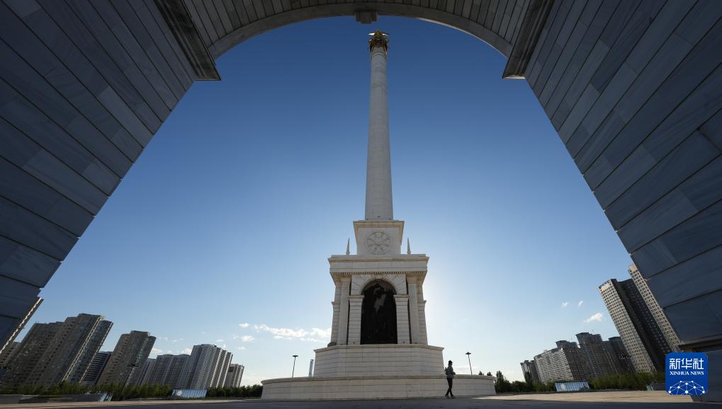 這是6月29日拍攝的哈薩克斯坦首都阿斯塔納獨(dú)立廣場(chǎng)上的紀(jì)念柱。