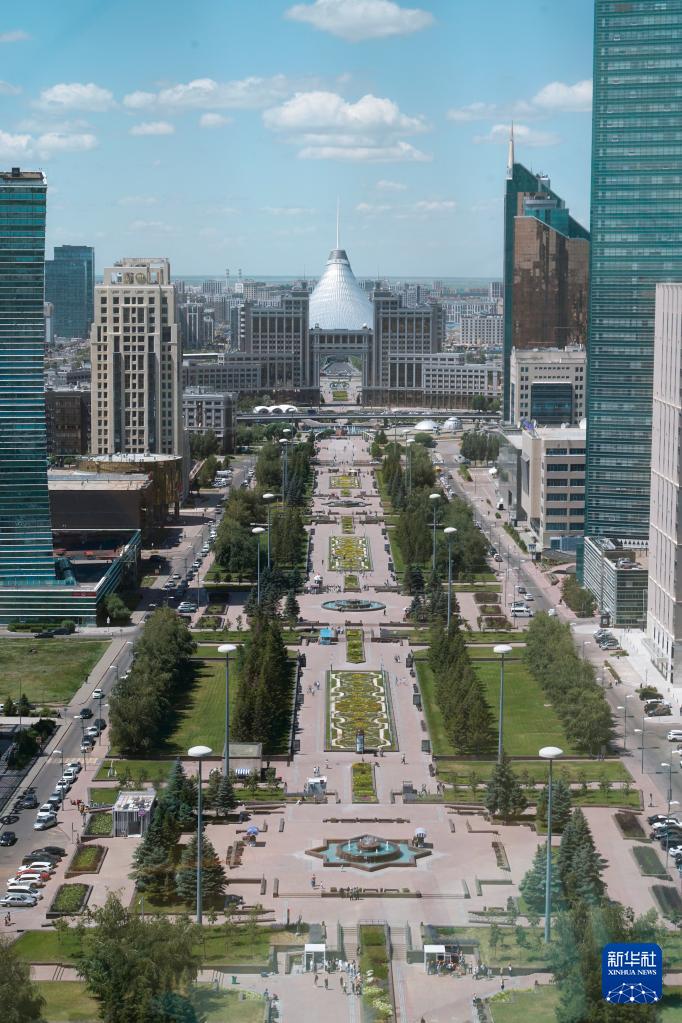 這是6月29日拍攝的哈薩克斯坦首都阿斯塔納的城市中軸線景觀。
