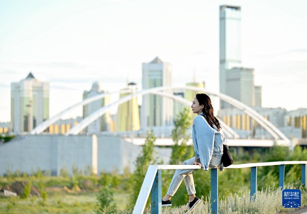 6月29日,在哈薩克斯坦首都阿斯塔納,一名女子在伊希姆河畔一處公園遠(yuǎn)眺。