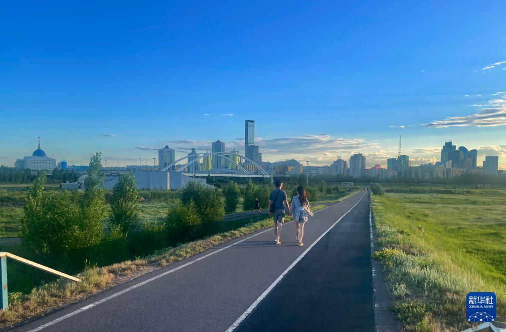 6月29日,人們?cè)诠_克斯坦首都阿斯塔納一處公園內(nèi)散步,遠(yuǎn)處是阿斯塔納城市天際線。
