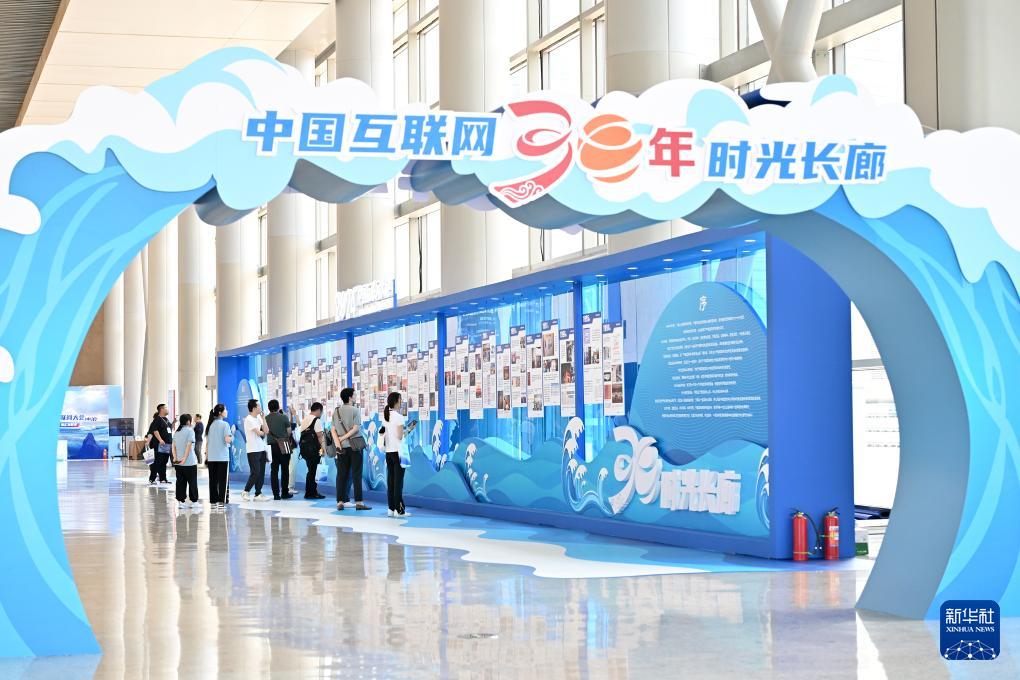 7月9日,與會(huì)者在大會(huì)展覽展示區(qū)設(shè)置的中國(guó)互聯(lián)網(wǎng)30年時(shí)光長(zhǎng)廊內(nèi)參觀。