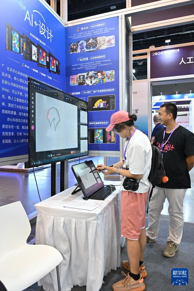7月9日,一名與會(huì)者(左)在大會(huì)的展覽展示區(qū)內(nèi)體驗(yàn)AI實(shí)時(shí)繪畫軟件。