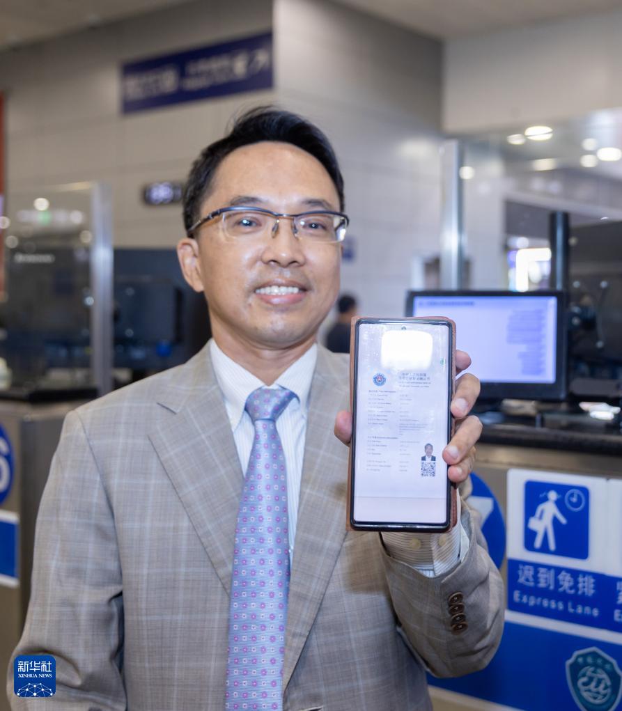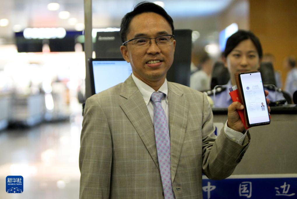 7月12日,在上海浦東國際機場,來自新加坡的鐘先生展示上海市公安局出入境管理局簽發(fā)的電子口岸簽證。他是第一位持我國電子口岸簽證入境的外國人。