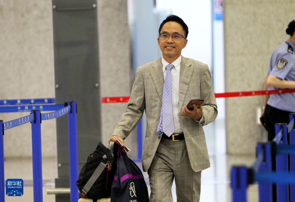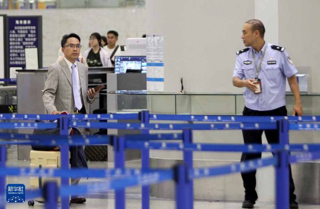 7月12日,手持中國第一張電子口岸簽證的鐘先生在工作人員引導(dǎo)下走向上海浦東國際機場邊檢口。