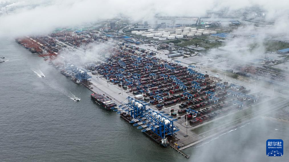 在欽州港碼頭,一艘貨輪駛離欽州港(7月31日攝,無人機(jī)照片)。