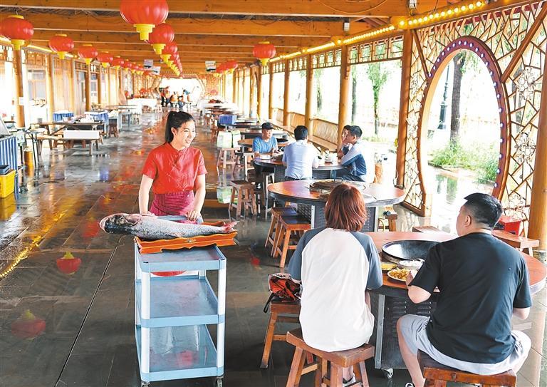7月23日,查干湖北景區(qū)碼頭,漁港民俗村農(nóng)家樂老板準(zhǔn)備為顧客制作特色菜鐵鍋燉大魚。