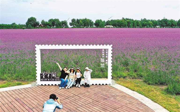 7月24日,游客在查干湖契丹島百花園拍照留念。這里的紫色花海一望無際,遠(yuǎn)處的風(fēng)電葉片迎風(fēng)起舞,景色格外迷人。