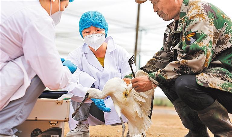 7月23日,查干湖國(guó)家級(jí)自然保護(hù)區(qū)鳥類救助繁育中心工作人員在救治受傷的國(guó)家二級(jí)重點(diǎn)保護(hù)野生動(dòng)物白琵鷺。近年來,查干湖周邊濕地成為鳥類棲息的樂園,鳥類品種增至276種。