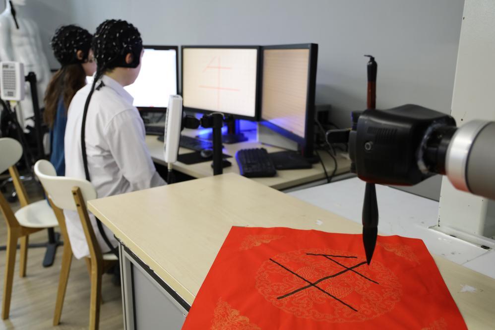 2021年2月2日,在天津大學(xué)醫(yī)學(xué)工程與轉(zhuǎn)化醫(yī)學(xué)研究院的實(shí)驗(yàn)室內(nèi),操作者通過(guò)人腦“意念”操縱機(jī)械臂書(shū)寫(xiě)“牛”字。新華社記者 宋瑞 攝