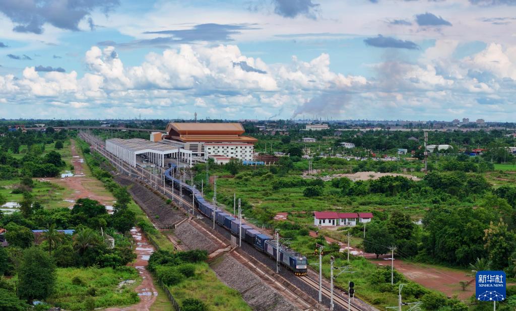 8月5日,由老撾籍火車司機獨立駕駛的滿載貨物的列車駛出萬象站,向中國昆明進(jìn)發(fā)(無人機照片)。