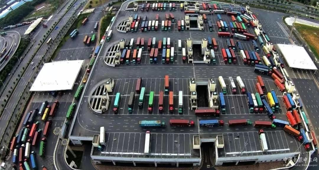 △浙江義烏港等待通關(guān)的集裝箱貨車