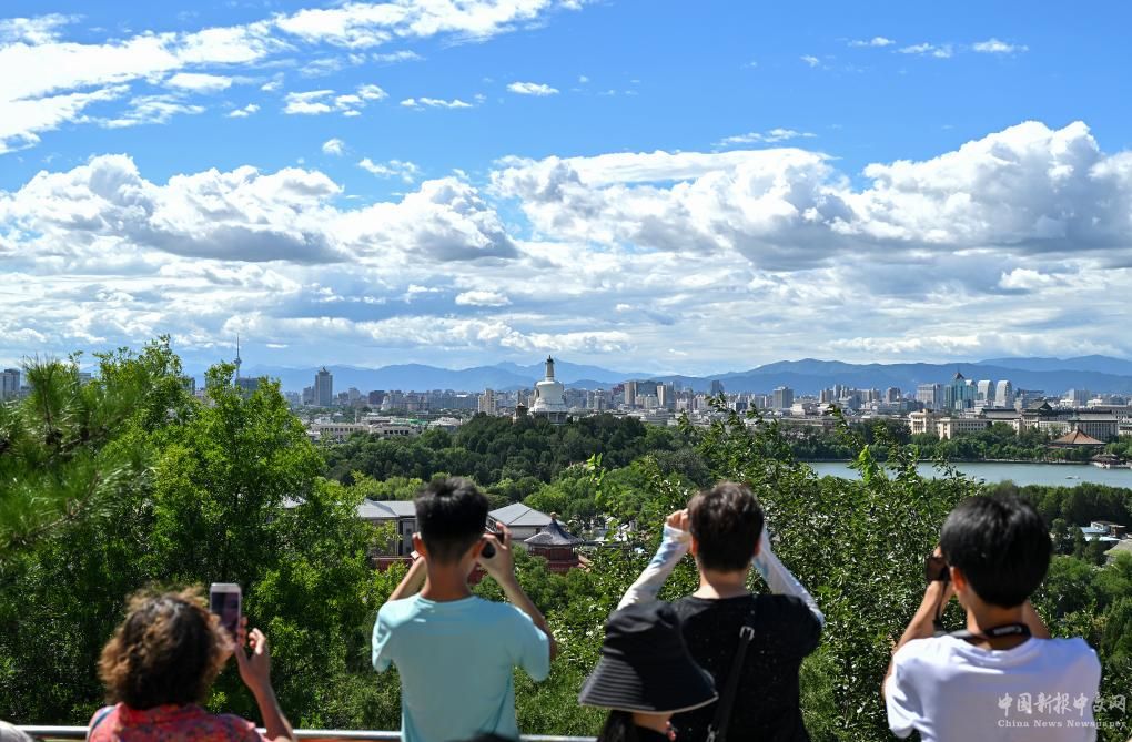 8月12日,游客從景山上拍攝遠(yuǎn)處的北海公園。新華社記者 李鑫 攝