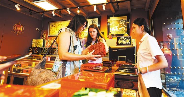 8月12日,平遙唐都推光漆器店,外國(guó)游客在選購(gòu)漆器。推光漆器是國(guó)家級(jí)非物質(zhì)文化遺產(chǎn),工藝獨(dú)特、色彩華美、圖案精巧,備受人們喜愛。