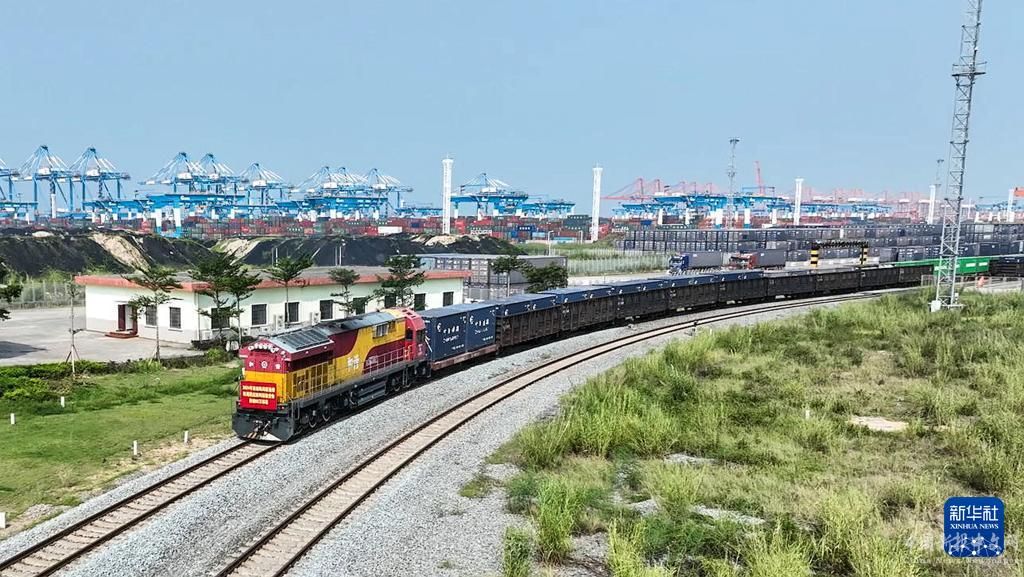 9月14日,滿載集裝箱的貨列駛離欽州港(無人機(jī)照片)。