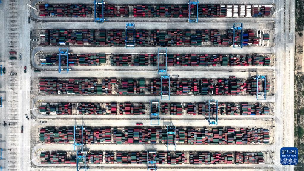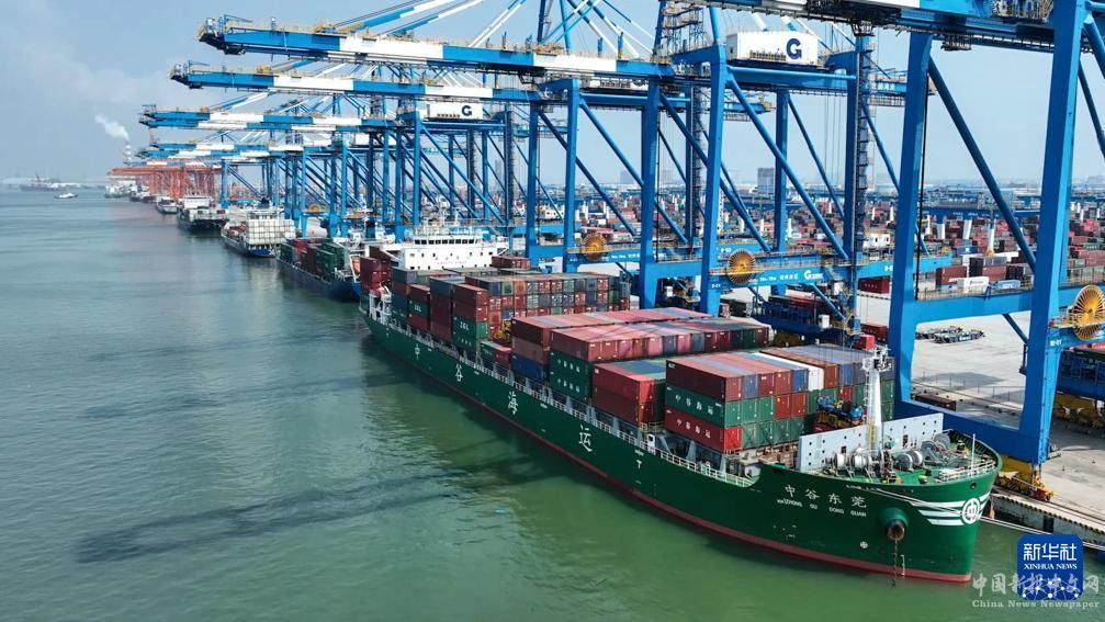 9月14日,一艘滿載集裝箱的海輪駛離欽州港碼頭(無人機(jī)照片)。