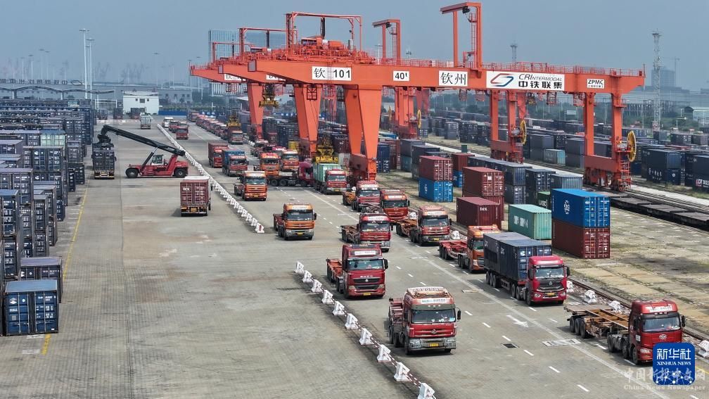 9月14日,在欽州鐵路集裝箱中心站,貨車在排隊(duì)轉(zhuǎn)運(yùn)集裝箱(無人機(jī)照片)。