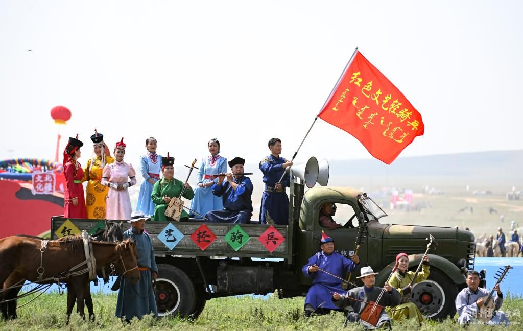 2024年7月14日,烏蘭牧騎隊(duì)員在內(nèi)蒙古第34屆草原那達(dá)慕開幕式上表演。新華社記者 貝赫 攝