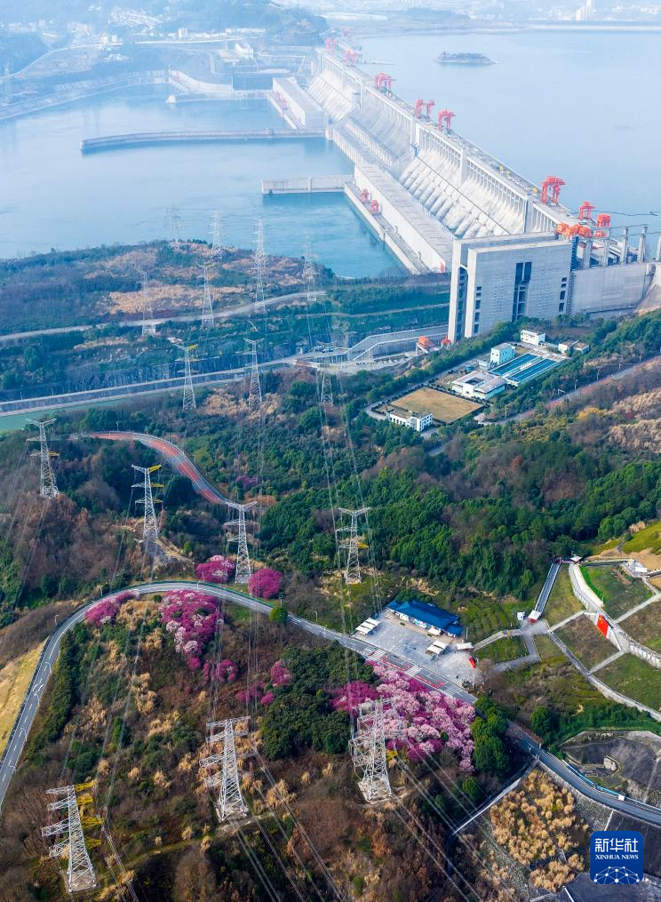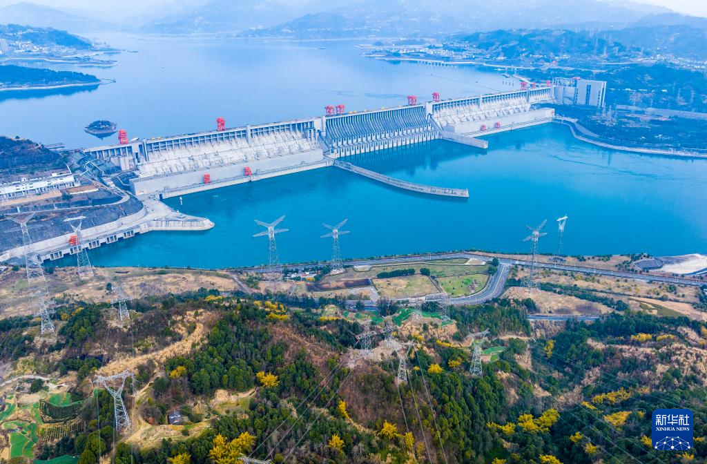 2月7日在湖北宜昌拍攝的三峽大壩和外送輸電線路(無人機照片)。