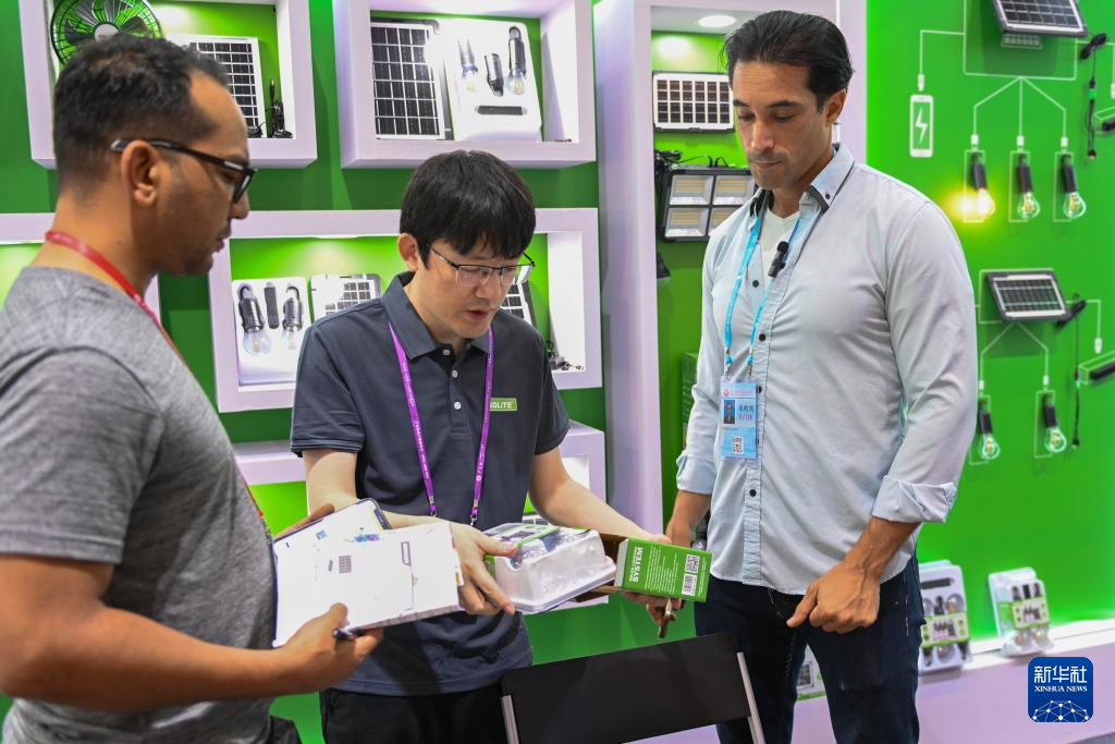 4月16日,客商在第137屆廣交會的新能源展區(qū)了解產(chǎn)品。