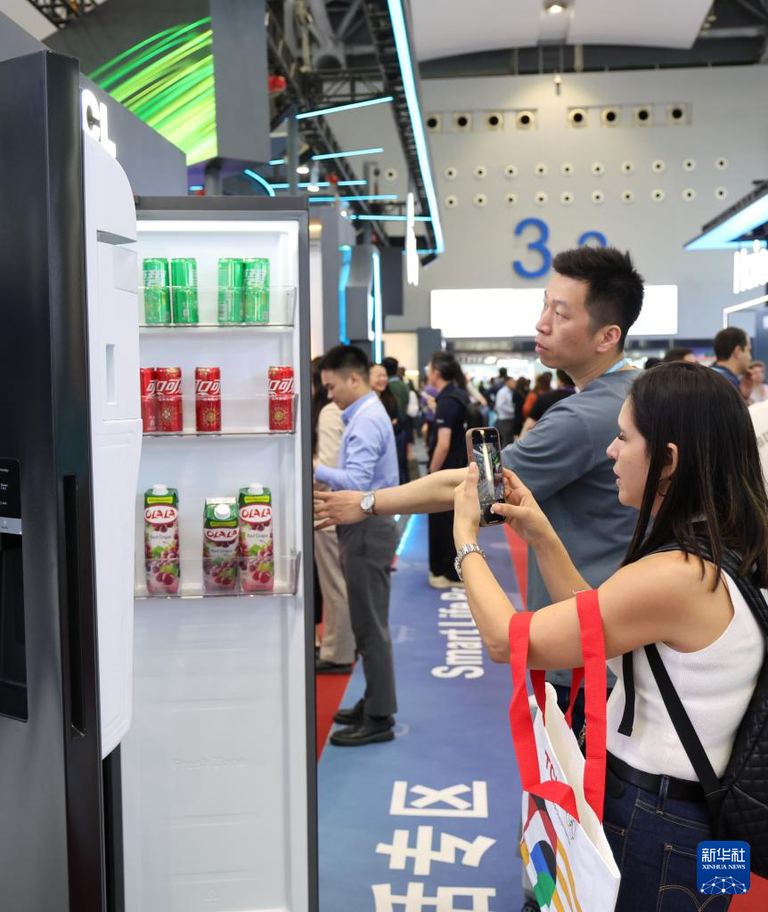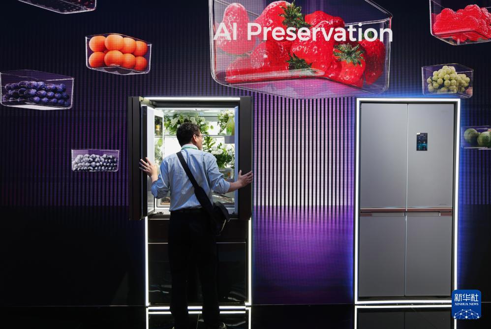 4月16日,客商在廣交會上參觀了解一款智能冰箱。