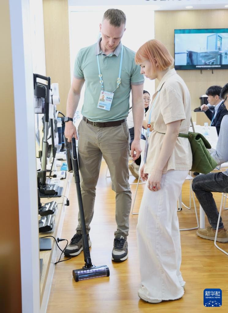 4月16日,客商在廣交會上參觀體驗一款吸塵器。