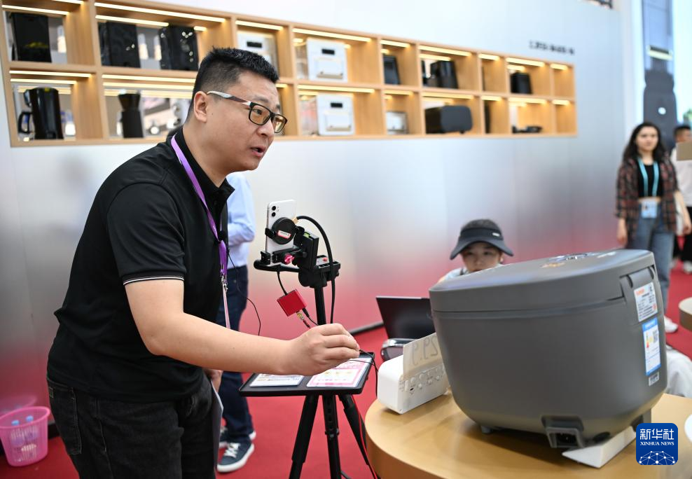 4月16日,在第137屆廣交會上,蘇泊爾展臺工作人員在直播電飯煲產(chǎn)品。