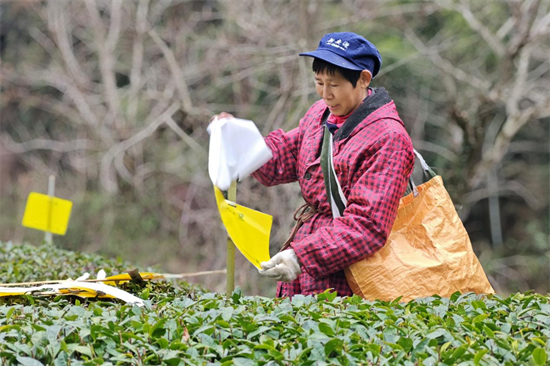 安徽休寧:茶鄉(xiāng)安插誘蟲黃板??助力春茶提質(zhì)增效