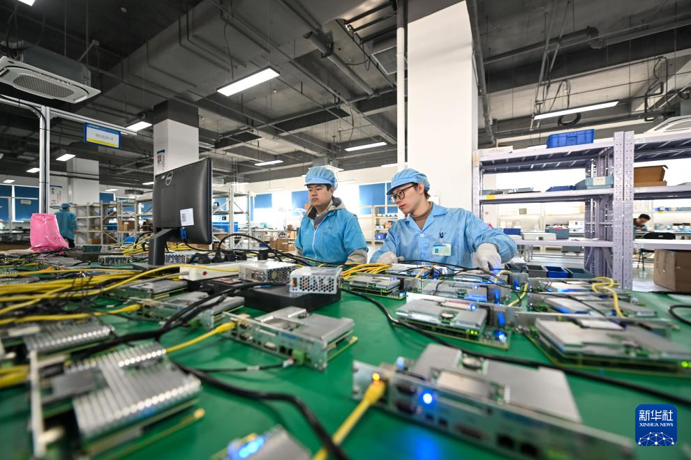 在位于京津中關(guān)村科技城的天津新松智能科技有限公司,工作人員對電子元器件進行檢測(2月20日攝)。
