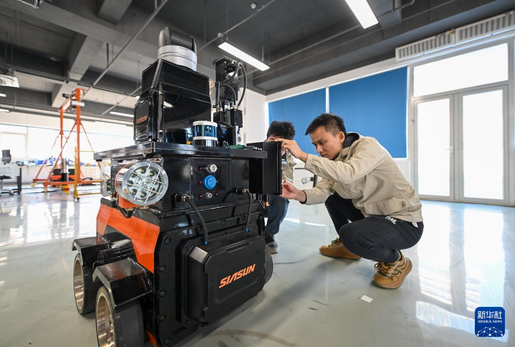 在位于京津中關(guān)村科技城的天津新松智能科技有限公司,工程師對一款礦井無人巡查機器人進行調(diào)試(2月20日攝)。