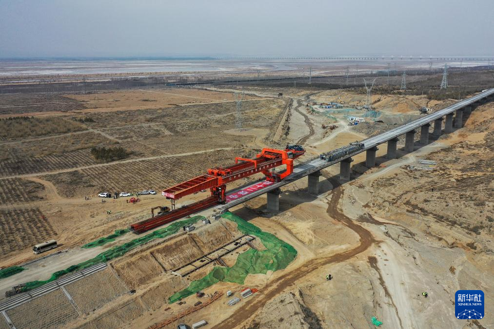 這是3月6日拍攝的順利合龍的包銀高鐵河源村特大橋(無人機(jī)照片)。