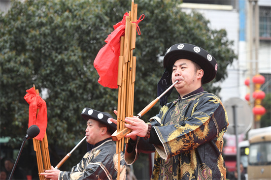 貴州省凱里市洗馬河街道文化社區(qū),一歌舞團(tuán)演員們?cè)?ldquo;春風(fēng)行動(dòng)”系列招聘會(huì)上表演蘆笙。(楊仁海 攝)
