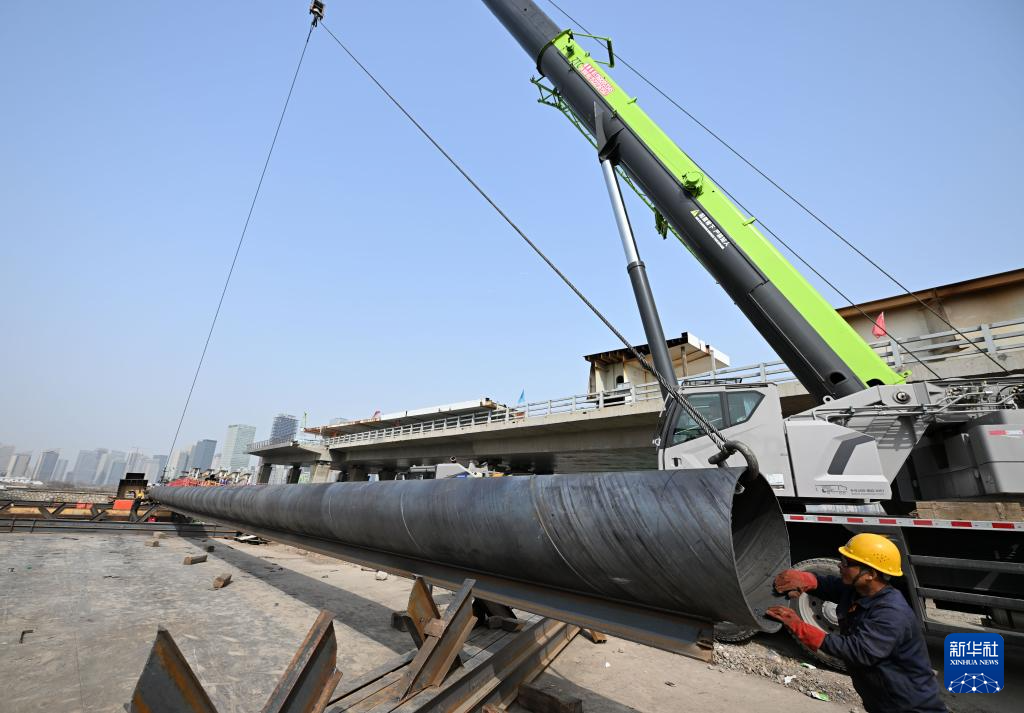 這是3月13日拍攝的位于天津市濱海新區(qū)的于新橋施工現(xiàn)場(chǎng)(無人機(jī)照片)。