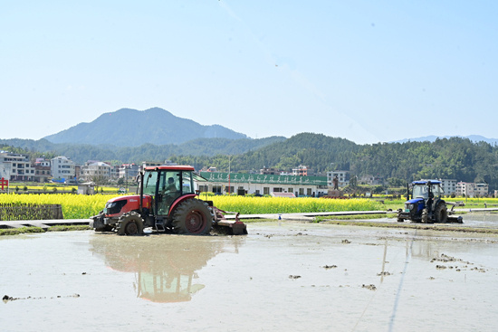 今年基地繼續(xù)承擔(dān)超級稻高產(chǎn)示范和再生稻高產(chǎn)示范兩項(xiàng)任務(wù)。 隨著氣溫回升,農(nóng)機(jī)手們搶抓晴好天氣,駕駛著大型耕田機(jī),在田間來回穿梭,濺起點(diǎn)點(diǎn)泥土,稻田里“土浪”翻滾躍動。這已是今年第二次翻耕,提前耕作、提前灌水浸田,使秸桿、雜草發(fā)酵腐爛,并能有效消滅一些蟲源,減少病蟲害。