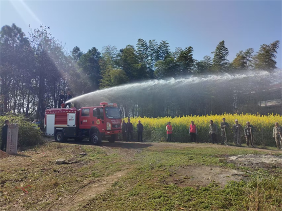 隨后,所有參訓人員參與了森林防滅火應急演練,模擬梅開村突發(fā)森林火情,護林員在巡邏中發(fā)現(xiàn)火情后,迅速向鎮(zhèn)森防指報告有關(guān)情況,鎮(zhèn)森防指立即啟動應急響應,立即組織鎮(zhèn)應急分隊趕赴現(xiàn)場進行撲救。根據(jù)山勢走向及火勢蔓延情況,鎮(zhèn)應急分隊隊員運用滅火拖把、電動噴水器、消防車高壓水槍等器具,快速、安全、有序的趕至起火點進行了模擬撲救,并做好了安全撤離、余火清理、現(xiàn)場留守等后續(xù)工作。整個應急演練過程緊張有序,充分展示了森林消防隊伍的快速反應、協(xié)同作戰(zhàn)能力。