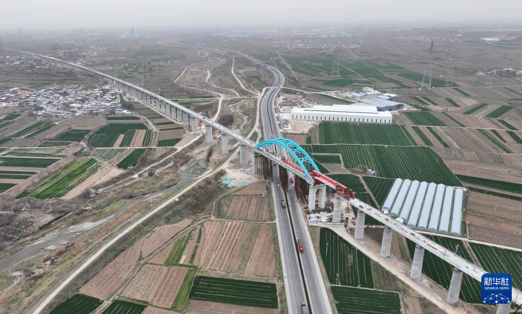 這是西延高鐵富平特大橋最后一孔箱梁架設(shè)施工現(xiàn)場(3月26日攝,無人機(jī)照片)。