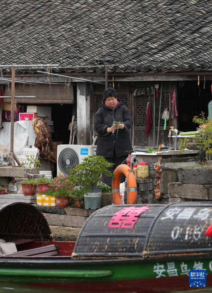 3月29日,居民在安昌古鎮(zhèn)的小河邊備菜。