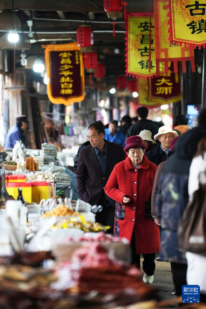 3月29日,游客在安昌古鎮(zhèn)的街市上購(gòu)買臘味食品。