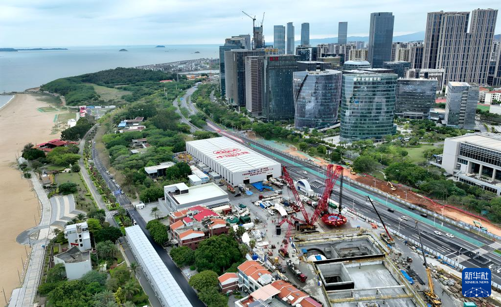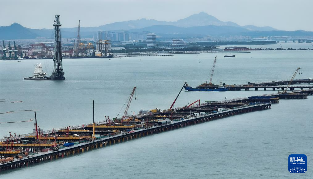 4月26日拍攝的廈金大橋(廈門段)項目海上橋梁和陸地隧道交接處工程施工現(xiàn)場(無人機照片)。