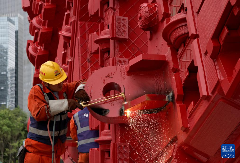 4月26日,超大直徑泥水平衡盾構(gòu)機“廈金號”盾構(gòu)機刀盤吊運前,中鐵十四局施工人員在進(jìn)行最后切割。超大直徑泥水平衡盾構(gòu)機“廈金號”總長165米,重約5100噸,最大開挖直徑16.15米。
