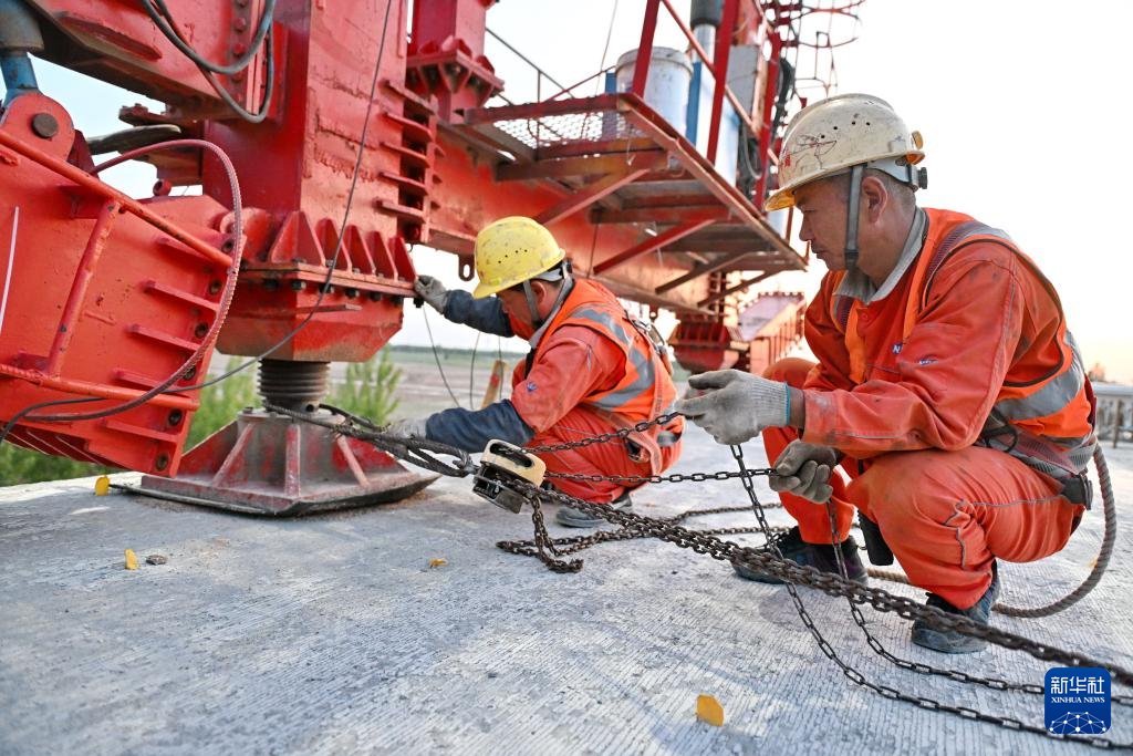 4月27日,中鐵二十局集團(tuán)工人在雄商高鐵河北段最后一孔箱梁架設(shè)現(xiàn)場作業(yè)。