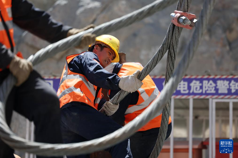 5月10日,中鐵二十局的建設(shè)者在蘭永臨高速公路洮河大橋施工現(xiàn)場進(jìn)行纜索吊裝系統(tǒng)試吊作業(yè)。