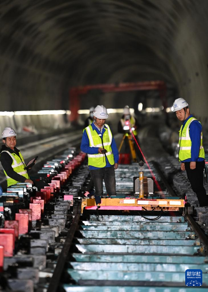 5月13日,在貫通的西康高鐵秦嶺九天山隧道內(nèi),施工技術(shù)人員在無(wú)砟軌道作業(yè)現(xiàn)場(chǎng)采集精調(diào)數(shù)據(jù)。